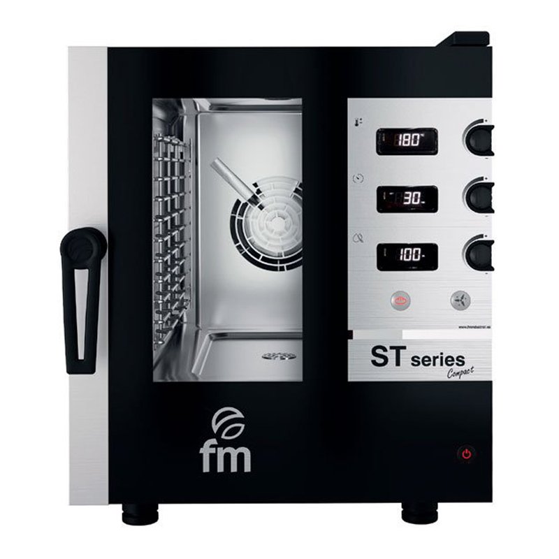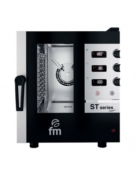Horno mixto STC 423 de FM perteneciente a la serie ST Compact, ideal para su uso en hostelería. Este horno profesional incorpora un display en el que el cocinero puede controlar la temperatura, el tiempo y la humedad. Incluye además, encoder de regulación dentro del panel de control.