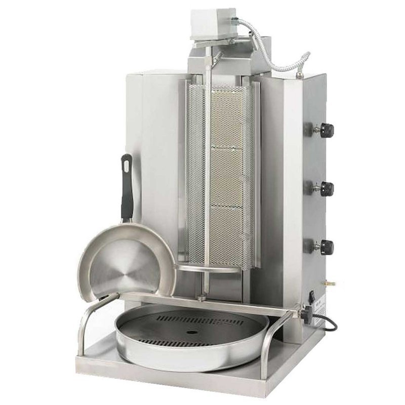 Tiene capacidad para 20 kg de carne de kebap. Los quemadores permiten la regulación independiente y cuentan con válvulas independientes para cada quemador.