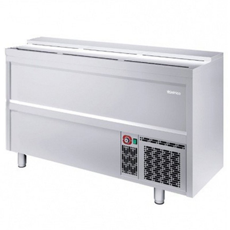 Enfriador de botellas de Infrico EB 1500II con una capacidad de 445 litros. Fabricado en acero inoxidable con el respaldo en acero galvanizado. Dispone de tres puertas correderas con el tirador incorporado. Tiene dos separadores para crear diferentes espacios.