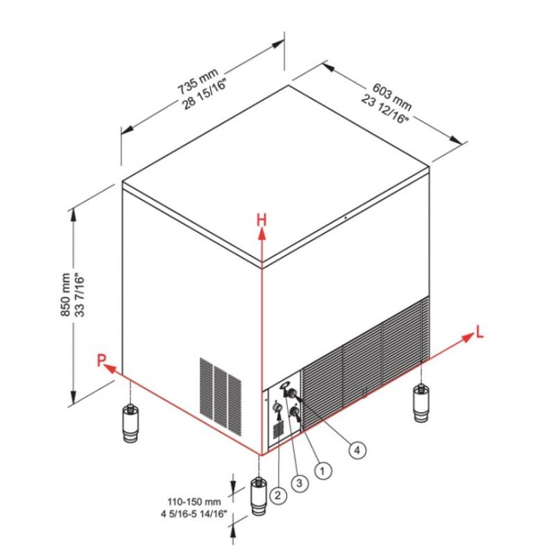 Sus dimensiones son 73 x 60 x 92 cm. Cuenta con una capacidad de producción alta para negocios de tamaño considerable.