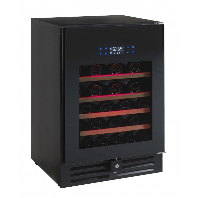 Vinoteca de la Gama Premium modelo CV-46-BL de Cave Vinum. Vinoteca expositora encastrable con sistema compresor monotemperatura. Con capacidad para 46 botellas. Incluye 5 estantes de hierro con detalles en madera, cerradura de seguridad y acabados premium.