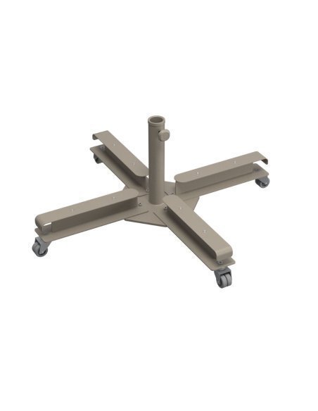 La base KIT CROSS en color taupe es una solución robusta y duradera para fijar parasoles de gran tamaño. Su estructura central está fabricada en hierro decapado, cincado y lacado al horno con pintura epoxi, ofreciendo una excelente resistencia a la intemperie y protección contra los rayos UV.